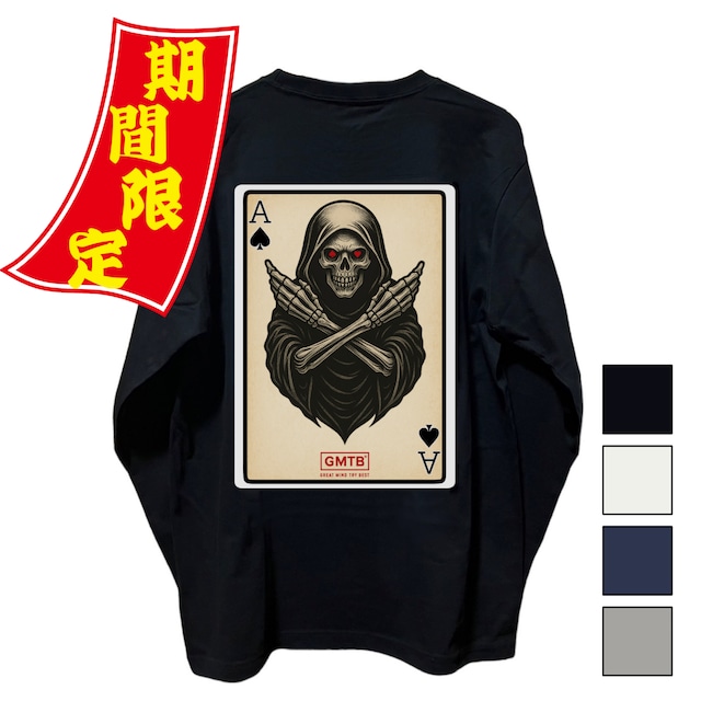 全品送料無料キャンペーン! さらに 2点以上お買い上げで宅急便でお届けします (๑˃̵ᴗ˂̵)ง ━━━━━━━━━✦━━━━━━━━━ GOGOキャンペーン開催中!! 豪華おまけ5点セット(2026年卓上カレンダー・A4クリアファイル・ステッカー・缶バッジ・懐かしの駄菓子) をプレゼントしています( ´͈ ᵕ `͈ ) ✧・゚: *✧・゚:* ━━━━━━━━━✦━━━━━━━━━ 【1週間限定販売!】 (販売終了:2月4日 23:59) =================== 作品紹介 =================== ※本商品にはダークアート・ホラー表現が含まれます。 刺激の強い表現が含まれるため、18歳未満の方は閲覧・購入をお控えください。 BLACK OF GMTB 260101 ACE OF FATE (エース・オブ・フェイト) スペードのエースは、死・運命・覚悟を象徴するカード。 このデザインに描かれているのは、 暴力ではなく「抗えない運命との契約」。 死神は獣ではなく、概念。 女性は恐怖ではなく、受容の表情を浮かべている。 生きることは、常に何かを賭けること。 愛、信念、人生、そのすべてを。 ACE OF FATE は、 逃げない者の前にだけ、静かに現れる。 【ご注意事項】 本商品はアート性の高いデザインのため、Instagramなど一部SNSでは投稿内容によって制限を受ける可能性があります。 投稿の際はご自身の判断にてお願いいたします。 =================== 販売期間・数量について =================== ・【販売期間:2月4日まで】(数量に達し次第、終了) ・このデザインは今しか手に入りません ・再販予定なし!あとで探しても手に入りません =================== ロングTシャツの特徴 =================== ・定番のレギュラーシルエット 程よいゆとりとフィット感を両立し、ストリートにもデイリーにも馴染む万能シルエット ・シルエットが綺麗 GMTB®︎のTシャツボディは、身幅・肩幅・着丈のバランスが絶妙で、スタイルが良く見えると好評 ・5.6オンスのやや厚手、しっかりした生地 ・洗濯に強く、へたれにくく長持ち ・首元はダブルステッチで型崩れしにくい設計 ・左胸&両手首にGMTBロゴ入り ・ユニセックス対応、オールシーズン使える万能ロンT =================== 発送目安 =================== ・通常2営業日以内に発送 ※注文集中時は遅れる可能性があります =================== ブランド紹介 =================== GMTBは2023年に誕生したアパレルブランド。 トランプをモチーフにした遊び心あるデザインと、日常で使える“本物志向”の品質を大切にしています。 =================== 素材 =================== ・コットン100% ※お色グレーのみ、コットン90%ポリエステル10% ※モニター環境により色味が異なる場合があります =================== サイズ目安 =================== ・男性 177cm/69kg:Lでジャスト、XLでゆったり ・男性 172cm/71kg:Lでジャスト、XLでゆったり ・女性 158cm:Sでジャスト、Mでゆったり ※サイズ実寸は画像最後をご確認ください ※サイズ違いによる交換・キャンセルは承っておりません =================== GMTBについて(スタッフの想い) =================== GMTBは、“着る人の人生が少しでも前向きに変わるように”という想いを込めて立ち上げたブランドです。 見た目のカッコよさはもちろん大切。でも、それだけじゃ足りない。 「毎朝、鏡の前で袖を通したときに、自分にスイッチが入る服」—— それがGMTBの目指しているTシャツやフーディーです。 サイズ感は、日本人の体型に合わせて「ちょうどいい」ゆとりとフィット感を追求。身幅・肩幅・着丈のバランスも調整を重ね、スタイルが綺麗に見えるシルエットを実現しました。 また、ロゴデザインの形や配置にも徹底的にこだわり、視線の流れとスタイルアップ効果を研究。力強さの中に、上品でスタイリッシュな存在感を宿しました。 素材も、何十枚ものサンプルから厳選し、デザイナー自身が何度も洗濯テストを繰り返し、洗濯に強くて長く着られる“本物の定番”を目指して選び抜いています。 そして、ロゴやプリントに込めたメッセージも、すべて意味があります。 “自分の生き方を信じる勇気”や、“一歩踏み出す決意”が、さりげなくデザインに込められています。 ファッションは自己表現であり、自分を変えるスイッチでもある。 そんな想いに共感してくれる仲間が、ひとりでも増えたら嬉しいです。 これが私たちGMTBの信念です。 =================== 他の商品・ロングTシャツ一覧はこちら =================== このデザインが気に入った方は、こちらもぜひチェックしてください ACE OF FATE 商品一覧 ▶︎https://gmtb.base.shop/search?q=aof ロングTシャツ商品一覧 ▶︎https://gmtb.base.shop/categories/5270350