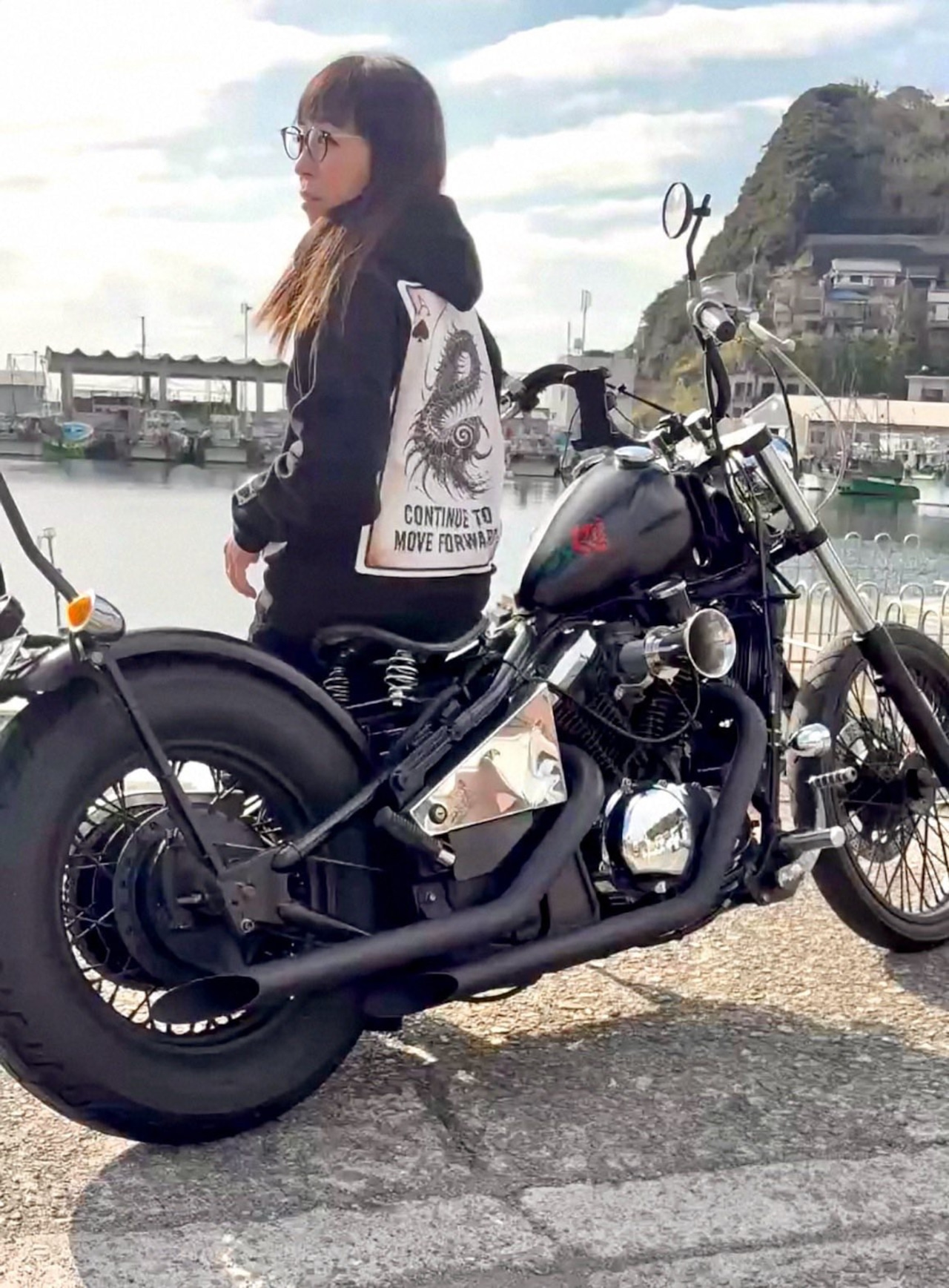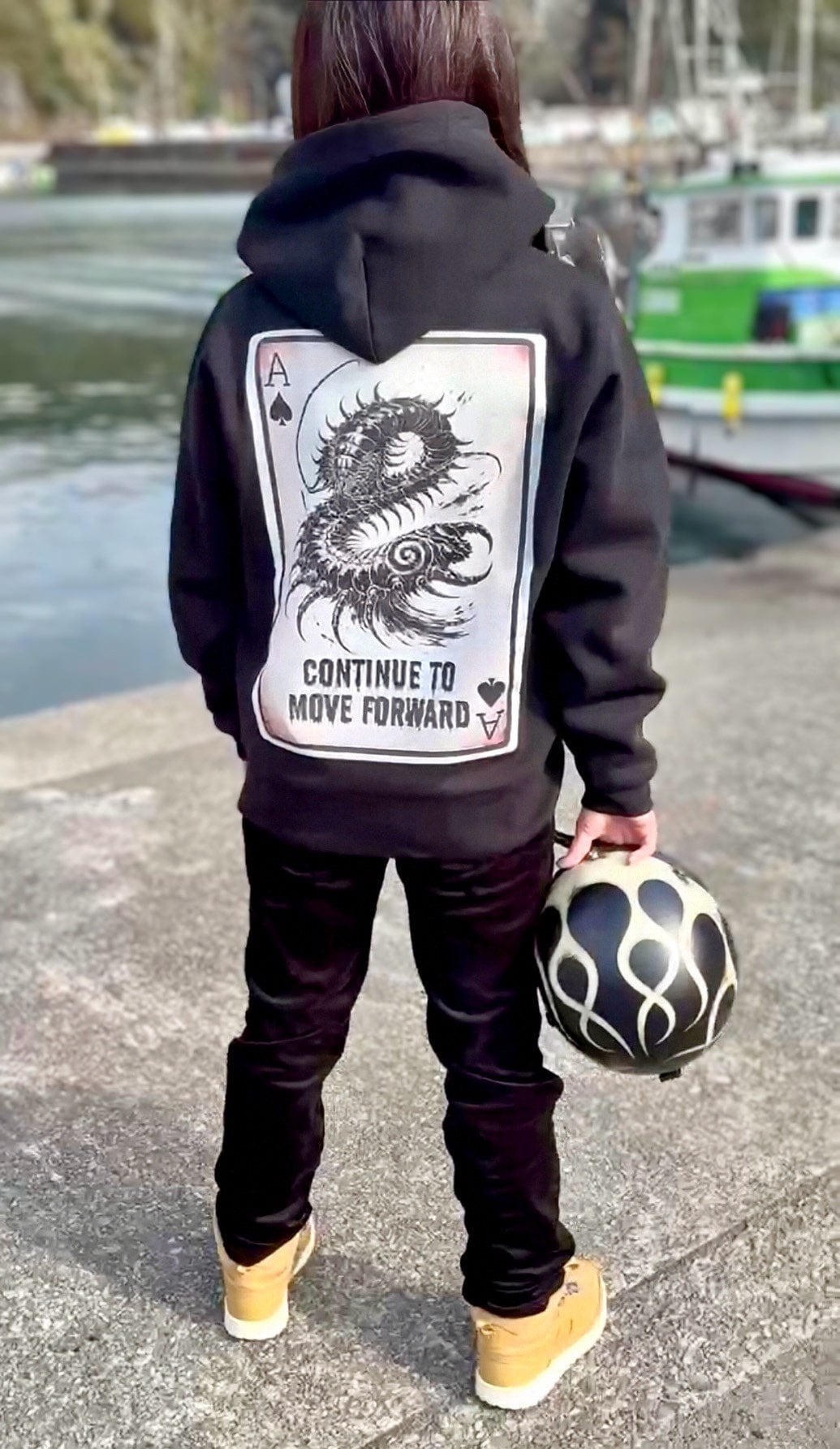 バイク乗りさんには前進し続けて欲しいと言う思いを込めて「continue to move forward」と言う英文を。